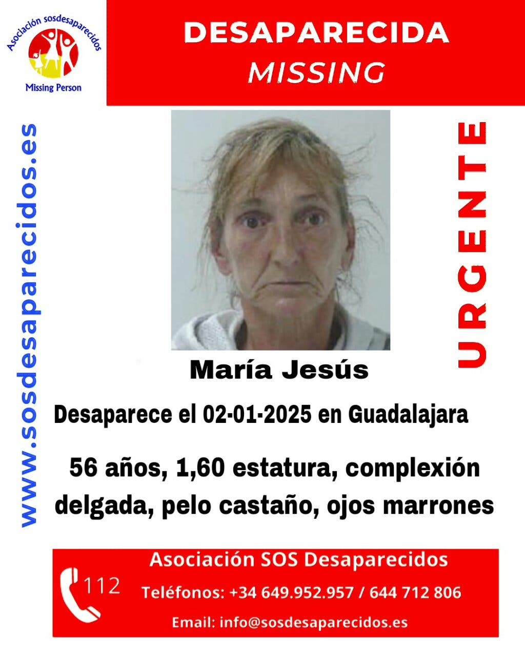 La asociación SOS Desaparecidos ha lanzado una alerta por la desaparición de María Jesús, una mujer de 56 años desaparecida en Guadalajara el pasado 2 de enero.
