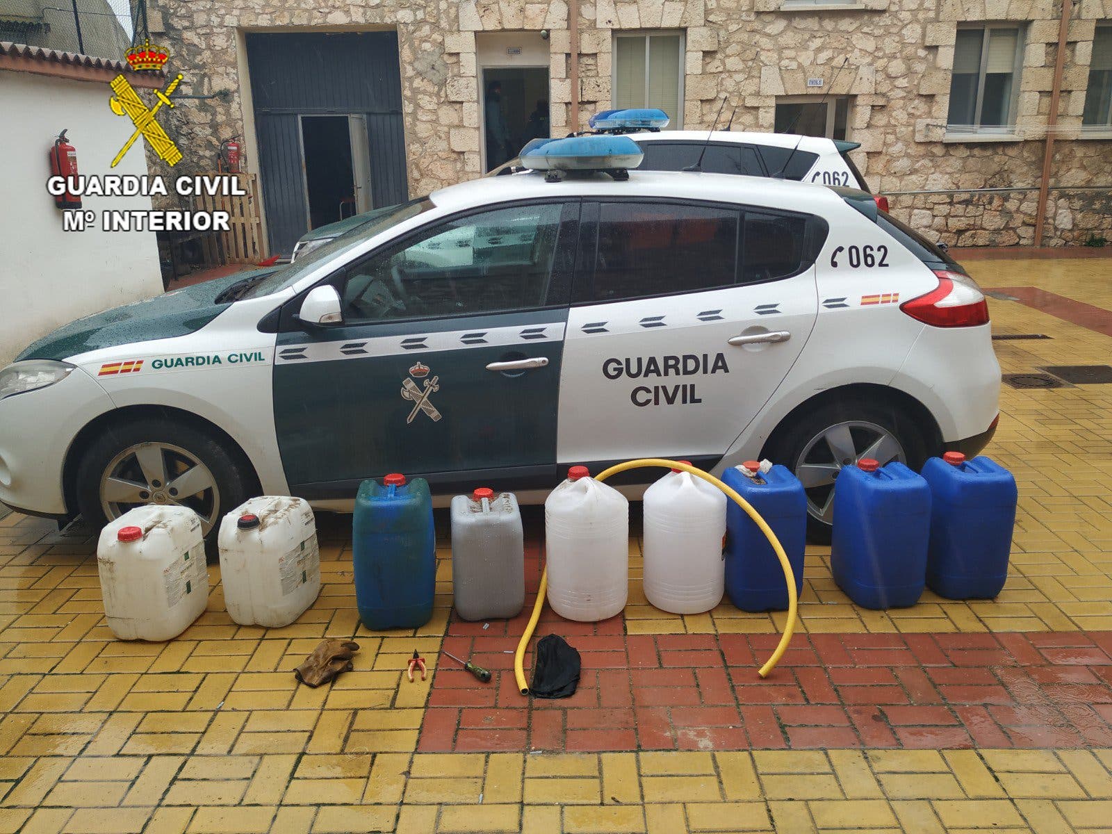 Por este motivo, se trasladó a estas cinco personas y al vehículo a las dependencias oficiales de la Guardia Civil en Torijapara el total esclarecimiento de los hechos pudiéndose establecer que estas personas acababan de sustraer el combustible de una nave agrícola de Trijueque, ya que el propietario de la misma reconoció como suyas las garrafas que transportaban.