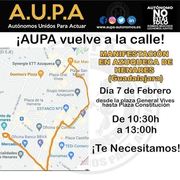 La asociación de autónomos AUPA, junto a los comercios de Azuqueca, han organizado el próximo 7 de febrero una manifestación «contra la inseguridad que están sufriendo nuestros comerciantes», que son «víctimas de robos casi a diario, de noche, de día y con violencia», señala la asociación.