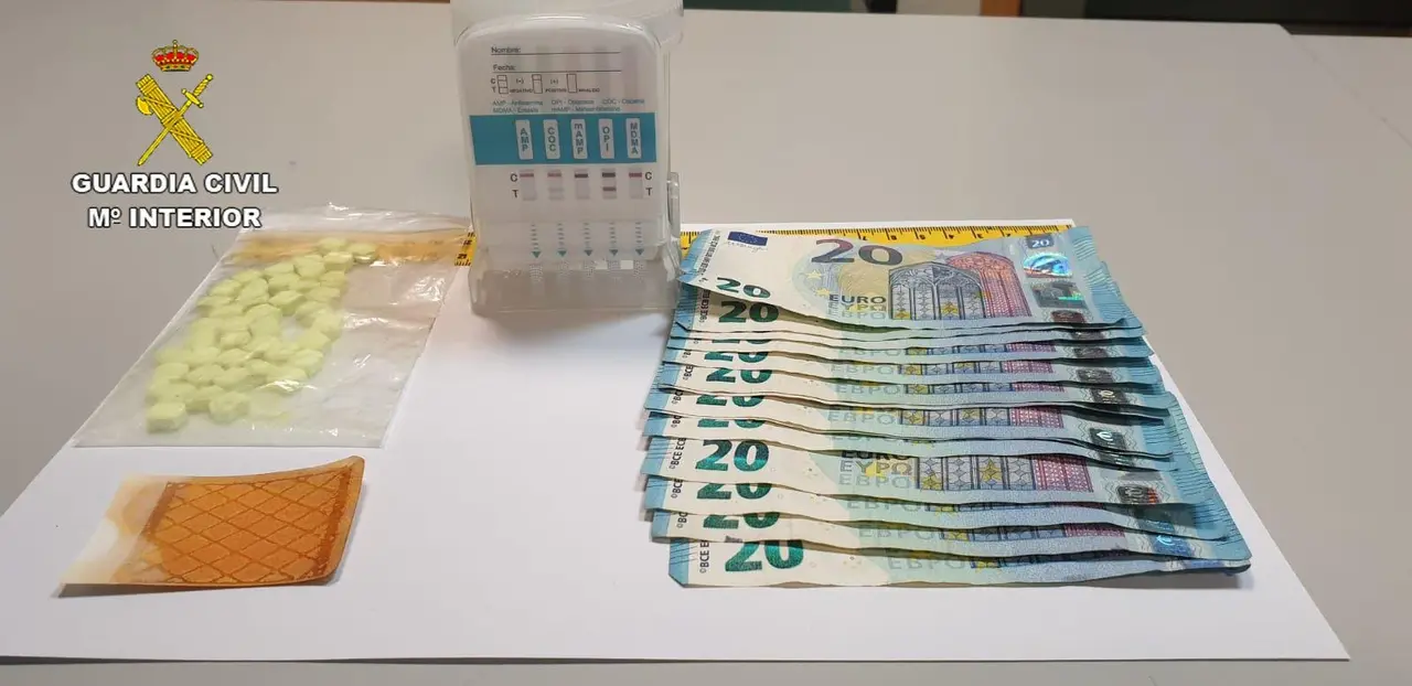 Una vez en el lugar, los agentes se entrevistaron con el conductor y procedieron a la identificación de la persona y a realizarle un cacheo superficial, localizando en un bolsillo interior de un bolso que llevaba en la cintura una bolsa que contenía 42 pastillas de éxtasis. También se le incautaron 280 euros.