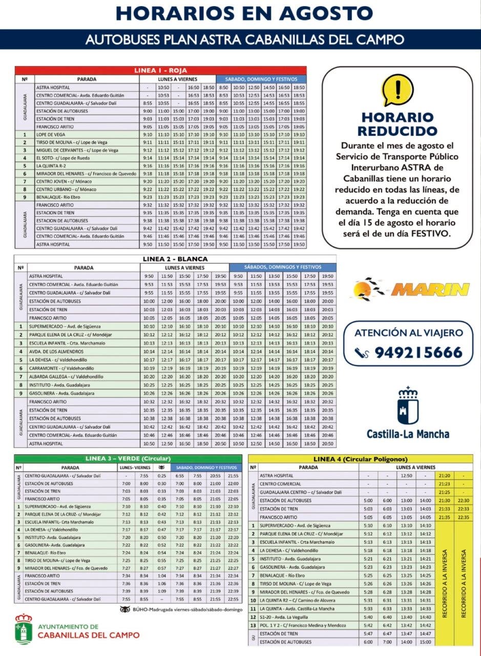 El servicio de autobuses interurbanos Guadalajara-Cabanillas, perteneciente al Plan Astra, va a experimentar unos ligeros cambios en su horario extraordinario de agosto, y también a partir del 1 de septiembre, en lo que se refiere al horario ordinario.