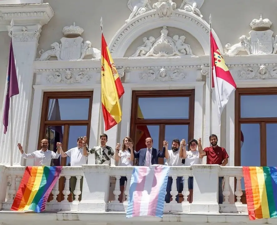 El nuevo alcalde de Guadalajara, el socialista Alberto Rojo, acompañado por dos integrantes de las asociaciones WADO y Chrysallis y de representantes de los grupos municipales de Ciudadanos, PP, Unidas Podemos y Aike, ha desplegado en el balcón de la Casa Consistorial dos banderas arcoíris y una representativa del colectivo trans, coincidiendo este viernes, 28 de junio, con la conmemoración del Día del Orgullo LGTBI.