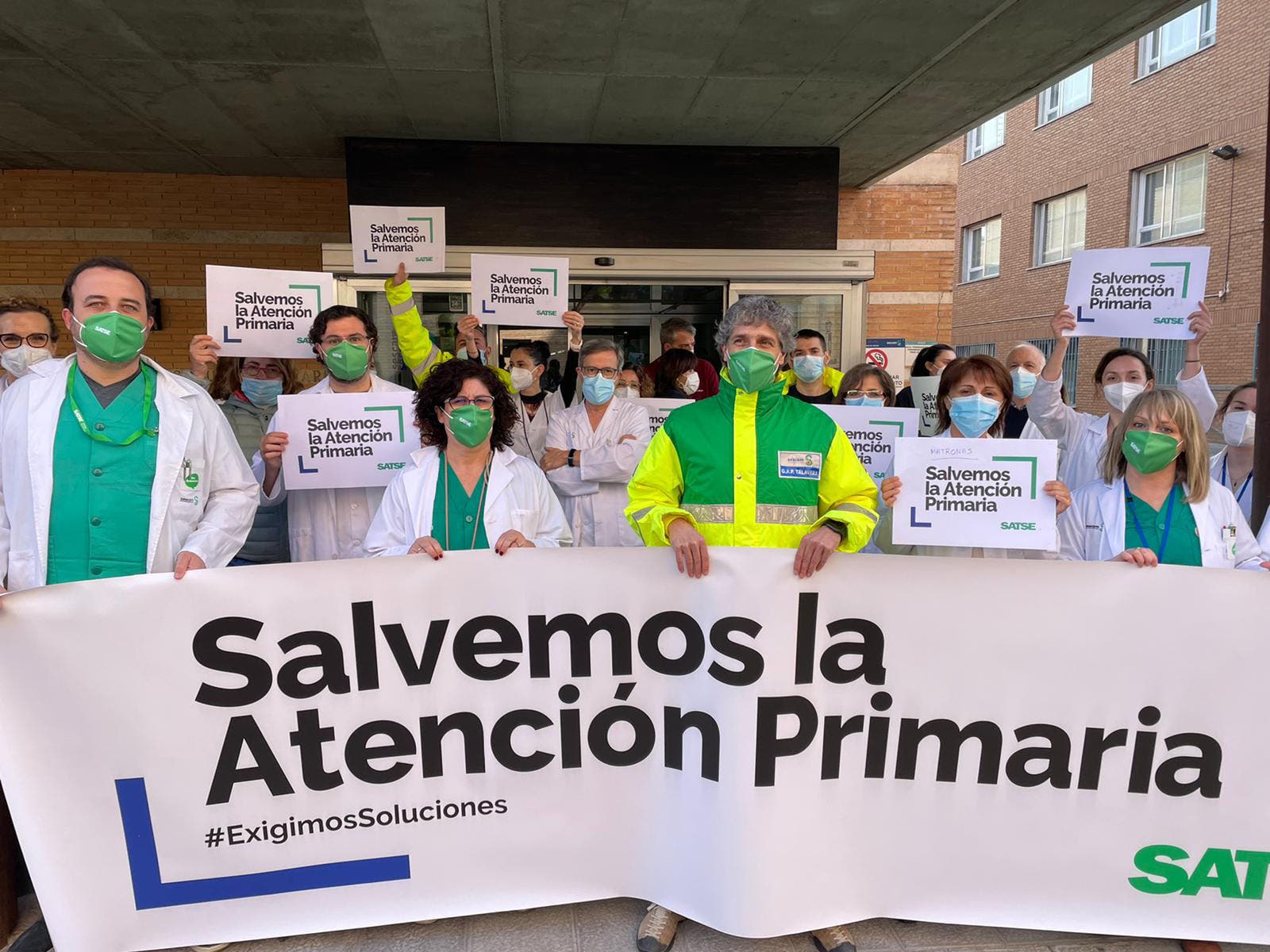 Con pancartas en las que se podía leer «Salvemos la Atención Primaria», las enfermeras y fisioterapeutas convocados por el Sindicato de Enfermería, SATSE, han mostrado su «profundo malestar porque, después de dos años de lucha contra la pandemia y haber escuchado muchos compromisos por parte de los responsables públicos y políticos, la situación que sufren a diario es de una crónica escasez de medios y recursos mientras la sobrecarga y tensión asistencial es cada vez mayor».