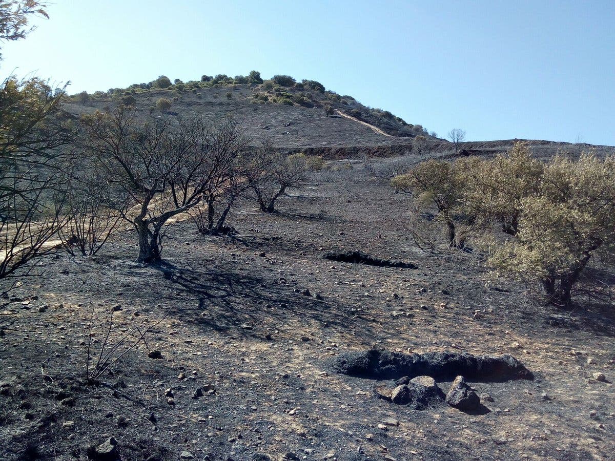 Finalmente, se ha declarado su extinción completa este viernes a las 17.30 horas tras arrasar 25 hectáreas de monte bajo, olivos, encinas y matorral.