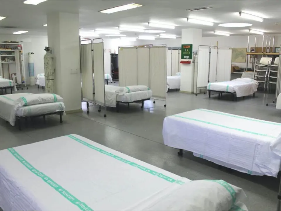 Esta zona se ha dotado para ello de camas, biombos para garantizar la intimidad de los pacientes y de tanques de oxígeno. Se trata de un área que se emplearía como una zona de estancia intermedia antes de su ingreso, y sólo si fuera preciso ante la posibilidad de que se diera un aumento de los mismos.