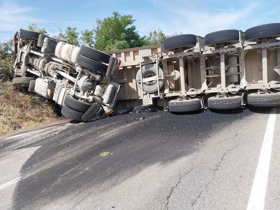 Guadalajara: Aparatoso vuelco de un camión que transportaba grava en la CM-110
