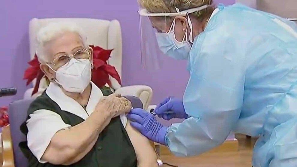Araceli, una mujer de 96 años, ha sido la primera persona en recibir la vacuna de Pfizer contra el coronavirusen España este domingo 27 de diciembre, en una residencia de mayores de Guadalajara.