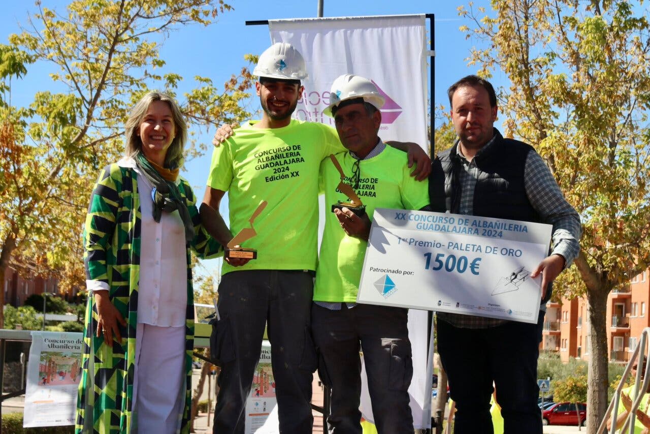 La cuadrilla formada por Juan Manuel de la Rosa y Manuel de la Rosa, padre e hijo y albañiles de Fontanar, se alzó con la Paleta de Oro del primer premio del XX Concurso de Albañilería de Guadalajara, premio dotado con 1.500 euros, que entregaba la alcaldesa de Guadalajara, Ana Guarinos, junto al presidente del Colegio de Aparejadores, José Luis Gárgoles.