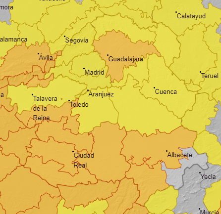 Los avisos de nivel naranja han comenzado, el primero de ellos, en la comarca toledana de Los Montes de Toledo, por lluvias y viento, a las 12 de la noche; tras lo cual a las 12 del mediodía entrarán en nivel naranja toda la provincia de Ciudad Real; siguiendo La Alcarria de Guadalajara a las 14 horas y, por último, las comarcas albaceteñas de Alcaraz y Segura y La Mancha, sobre las 16:00 horas de hoy.