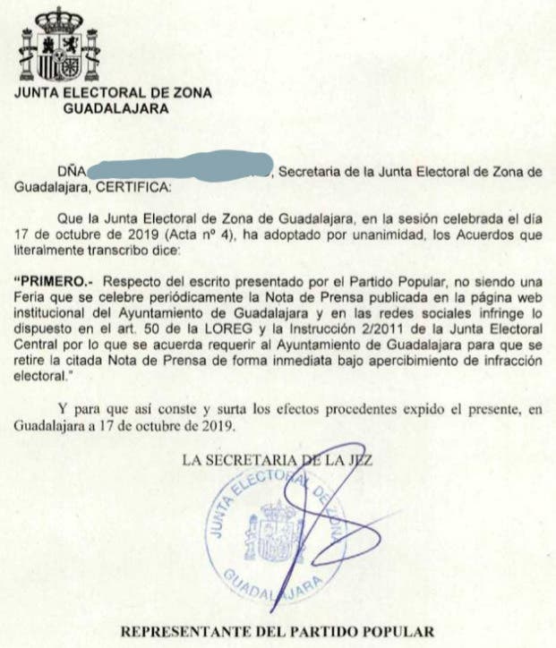La Junta Electoral de Zona de Guadalajara ha ordenado al Ayuntamiento que retire tanto de la página web institucional como de las redes sociales oficiales la nota de prensa publicada en relación a la presentación de las ferias temáticas que se van a realizar en el Mercado de Abastos, según publica El Heraldo del Henares.