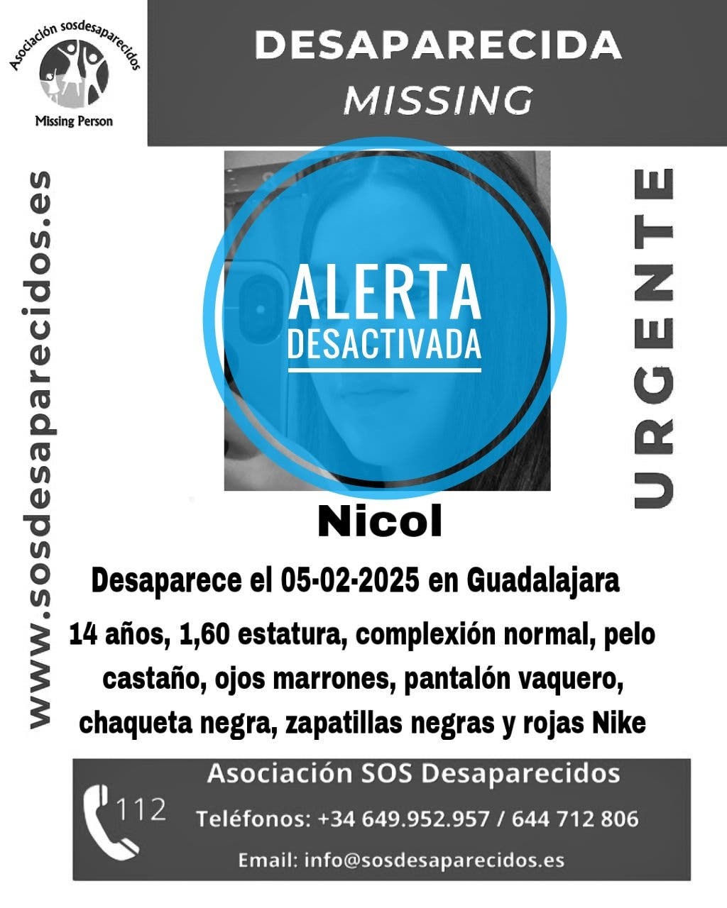 Nicol, la menor de 14 años desaparecida el pasado 5 de febrero en Guadalajara, ha sido localizada este viernes en Madrid y se encuentra en buen estado, según fuentes policiales.