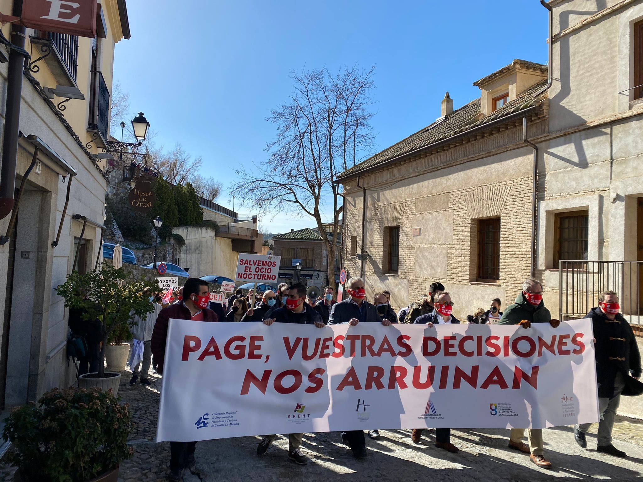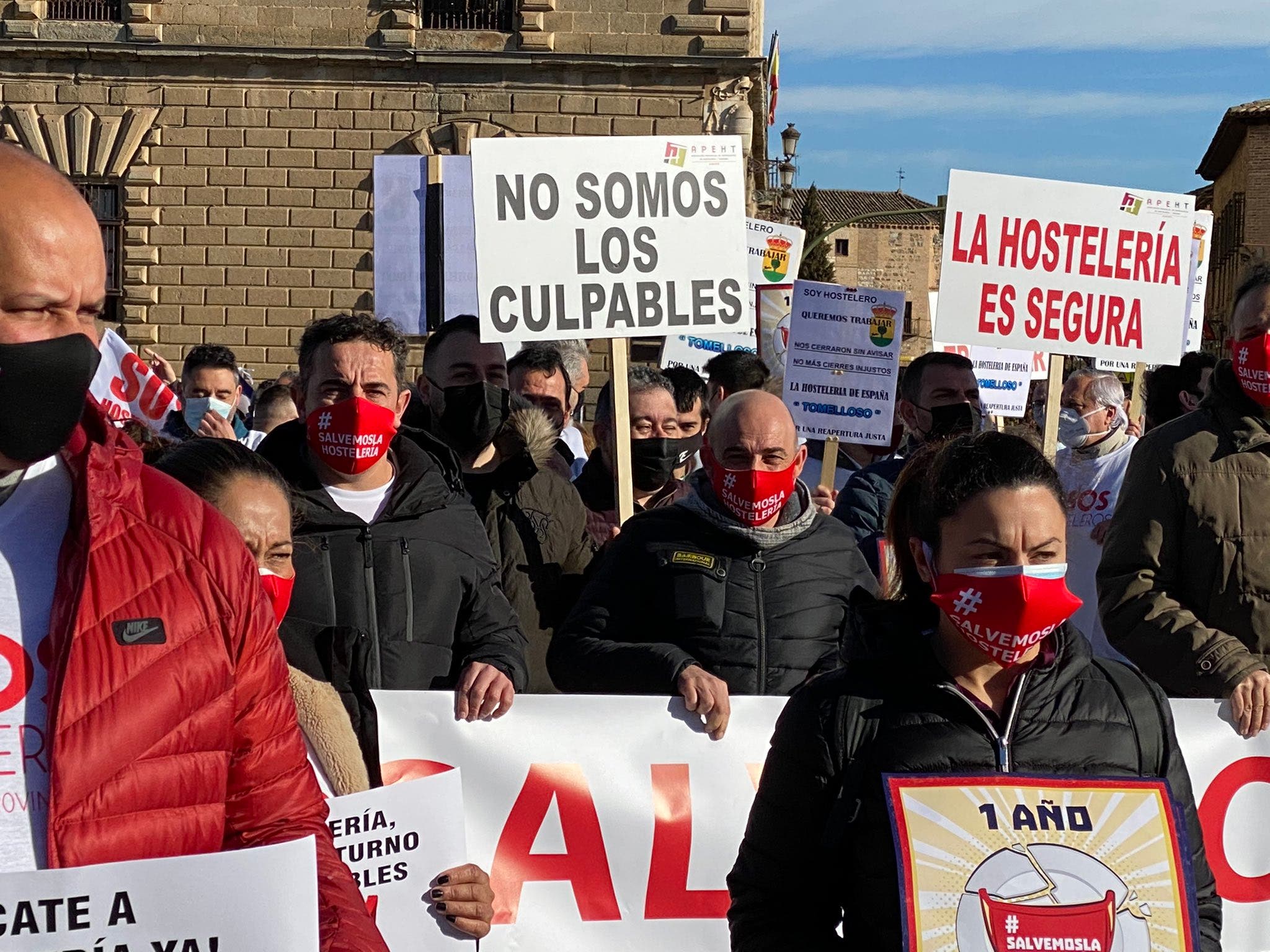 Los hosteleros de Castilla-La Mancha ha sido convocados este miércoles por la Federación Regional de Empresarios de Hostelería y Turismo a una manifestación que ha recorrido las calles de Toledo, en la que han mostrado su desacuerdo con la prórroga del cierre de la hostelería y han solicitado «la inmediata reapertura» de sus negocios.