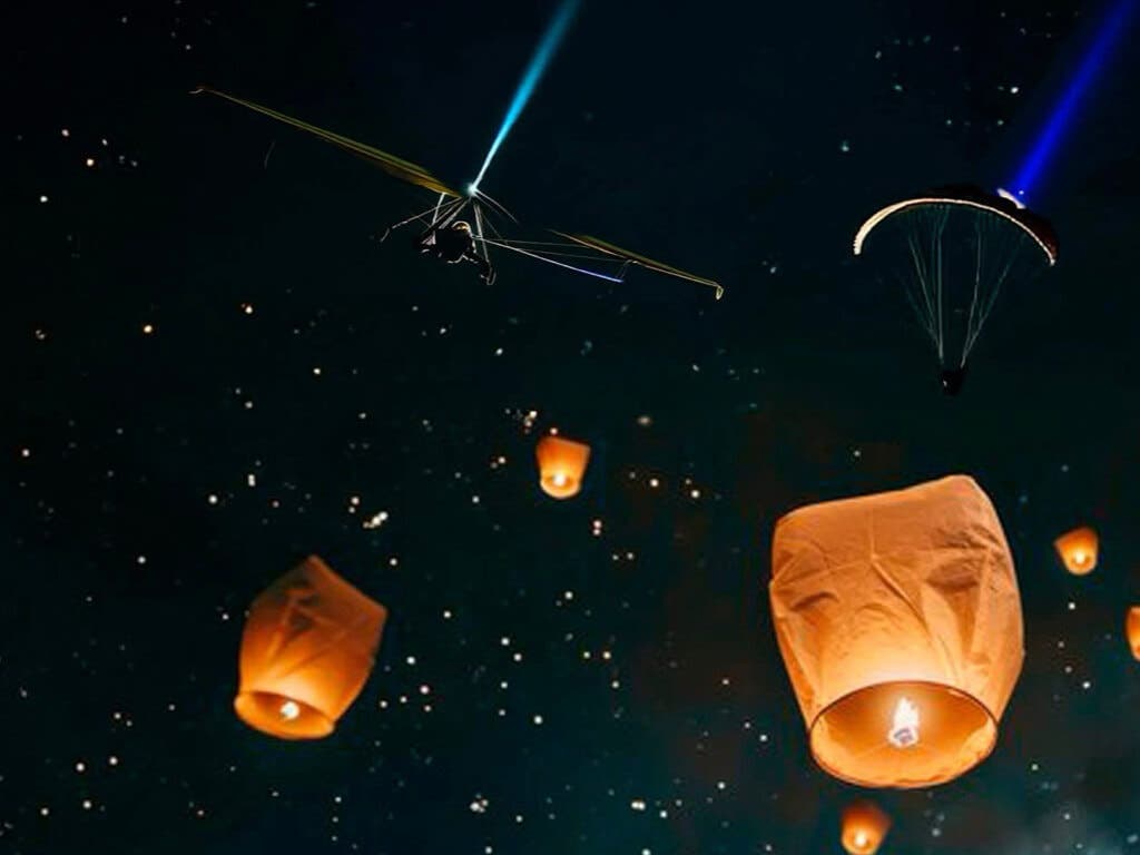 La peculiaridad de esta celebración es que la ilusión y la magia llegan volando ya que los Reyes Magos descienden ala delta y sus correspondientes pajes en parapente, adornados con bengalas y luces led de variados colores.