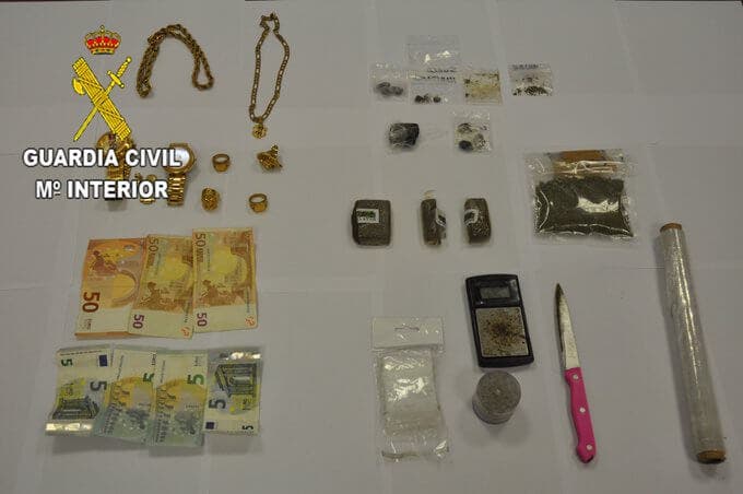 El pasado 12 de julio se procedió al registro, debidamente autorizado por la autoridad judicial, del domicilio que ocupaba M.D., donde se procedió a la detención de esta persona y a la incautación de distintas cantidades de hachís, marihuana y polen de hachís, dinero, diversas joyas (cuatro relojes, cuatro anillos, un cordón y una cadena), una báscula de precisión, bolsas de autocierre y otros objetos y enseres destinados a la preordenación al tráfico de drogas.