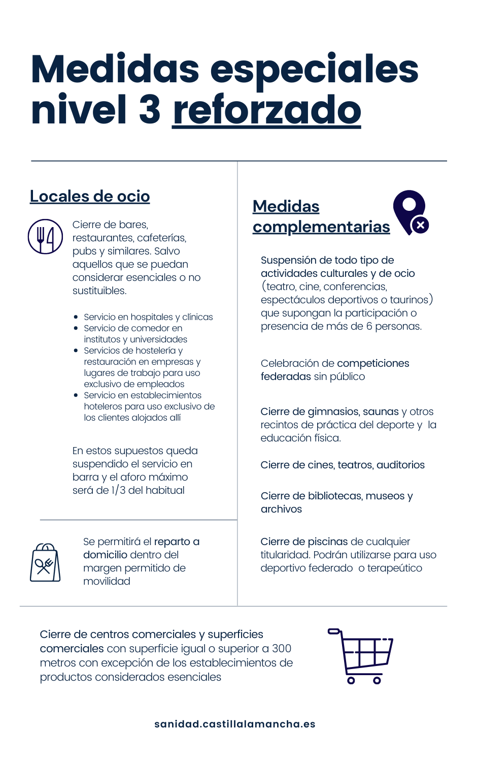 La Consejería de Sanidad del Gobierno socialista de Castilla-La Mancha, presidido por Emiliano García-Page, ha decretado medidas especiales nivel 3 reforzado, que implican el cierre de la hostelería, centros comerciales y gimnasios, entre otros establecimientos, en la Zona Básica de Salud de Yunqueras de Henares y Mondéjar, debido a la evolución desfavorable de los contagios de Covid-19.