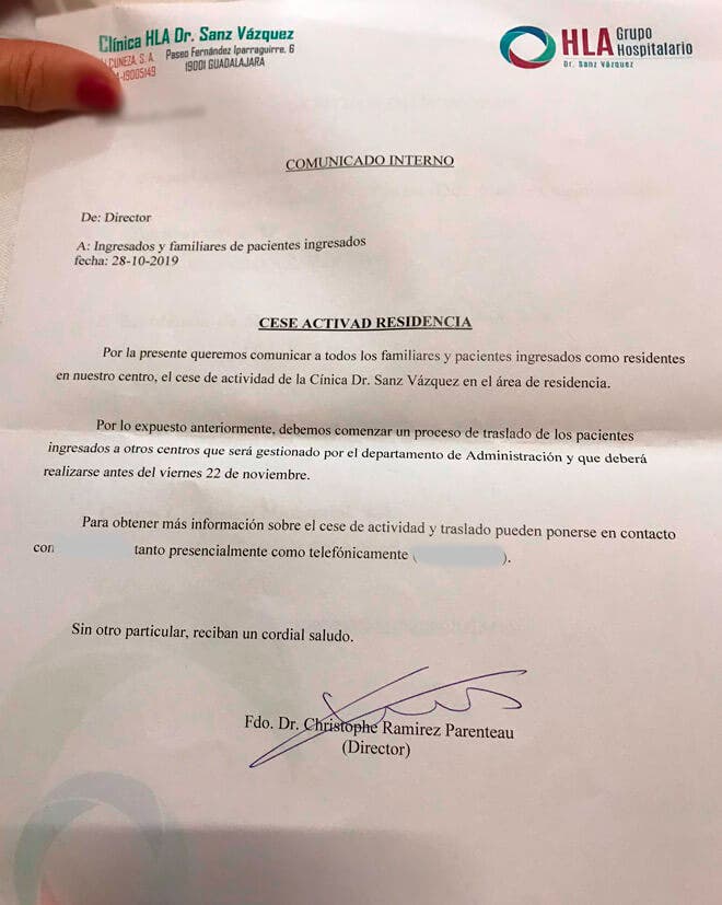 Según estos familiares, el pasado lunes 28 de octubre recibieron en mano una carta firmada por el director del centro, Christophe Ramírez Parenteau, según la cual se les comunicaba «el cese de la actividad de la Clínica Dr. Sanz Vázquez en el área de residencia».