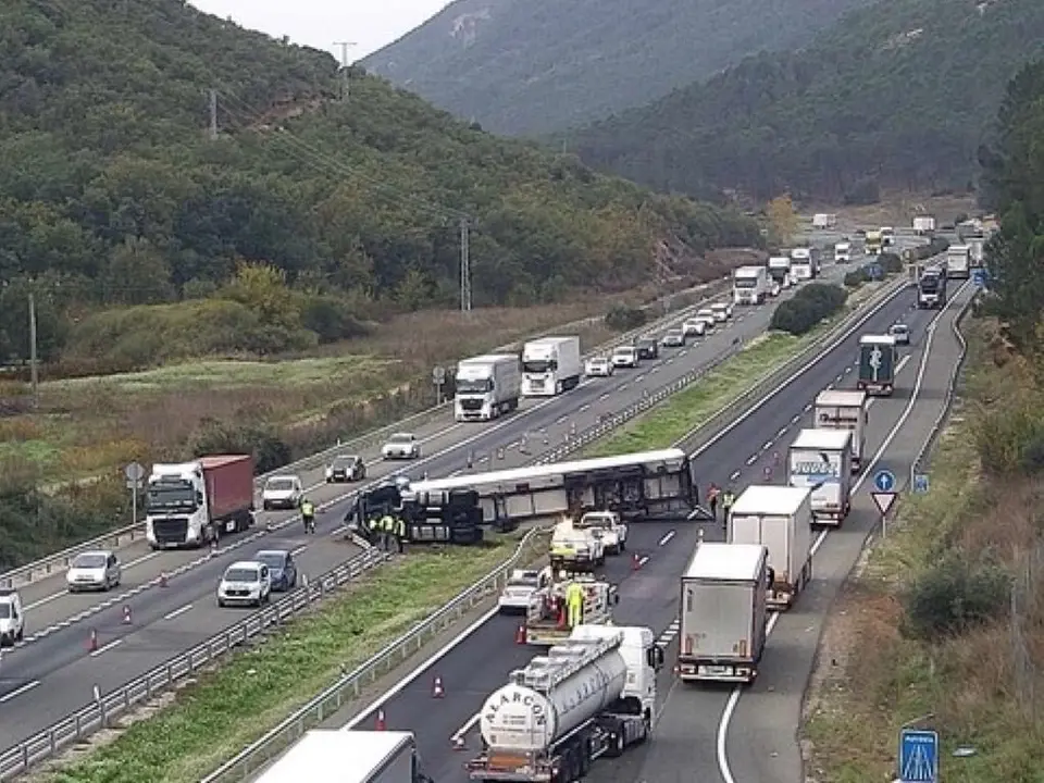En ese punto se ha producido la salida de vía de un camión, que pasa la mediana de la autovía y queda obstaculizando los carriles izquierdos de ambos sentidos, provocando la colisión de dos turismos y otro camión.