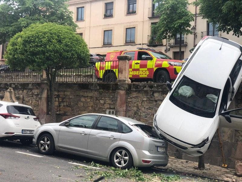Un coche cayó encima de otro aparcado en Sigüenza (Guadalajara) al fallarle al primero los fresnos y precipitase de una calle a otra paralela de menor altura, llevándose por delante una valla.