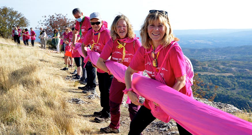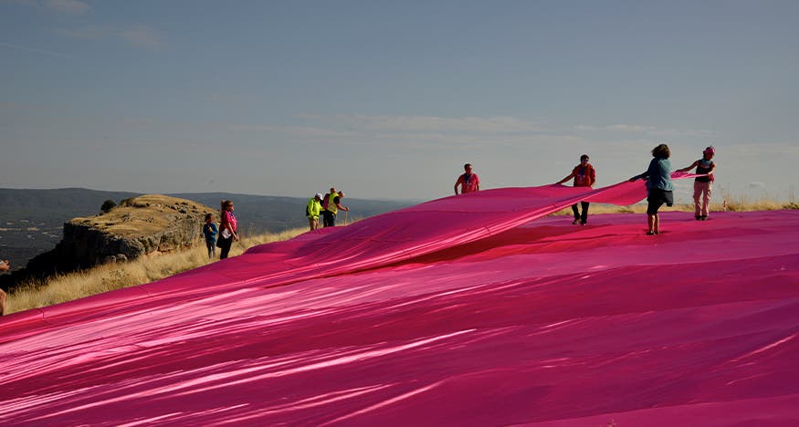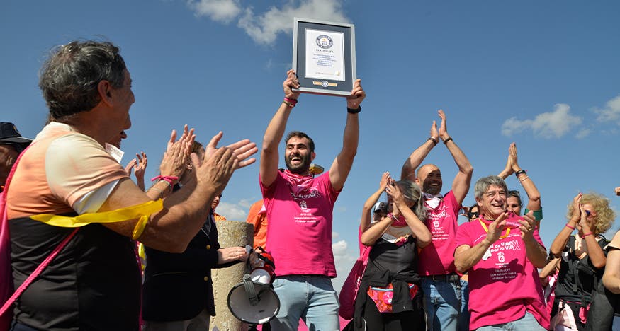 Más de 500 voluntarios y voluntarias consiguieron desplegar el sábado sobre los cerros Tetas de Viana, en la pedanía de Viana de Mondéjar, en el término municipal de Trillo (Guadalajara), el lazo rosa solidario más grande del mundo que, con exactamente 5.620 metros cuadrados de superficie, ha batido el último Récord Guinness conseguido en Dubai (Emiratos Árabes).