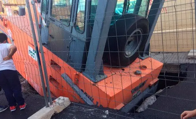La apisonadora no pudo ser extraída del agujero hasta la mañana del viernes, ya que para ello se hizo necesaria la presencia de una grúa de gran tonelaje que pudiera izar las 20 toneladas que pesa la máquina asfaltadora.