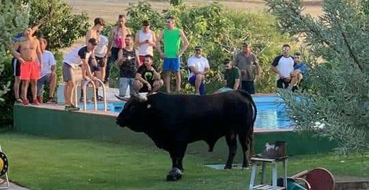 Un toro que participaba en un encierro por el campo en Iriépal, una pedanía del municipio de Guadalajara, acabó en la piscina de un chalé, según informa El Heraldo del Henares.