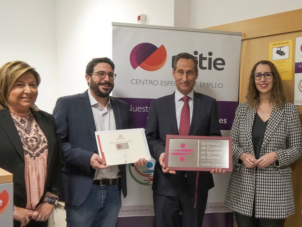 La consejera de Igualdad del Gobierno de Castilla-La Mancha, Sara Simón, entregó este jueves a los responsables del Centro Especial de Empleo Mitie SL de Azuqueca el distintivo de Excelencia en Igualdad de Género, un reconocimiento del Instituto de la Mujer de Castilla-La Mancha para entidades por su especial labor y contribución en favor de la igualdad de oportunidades entre hombres y mujeres.
