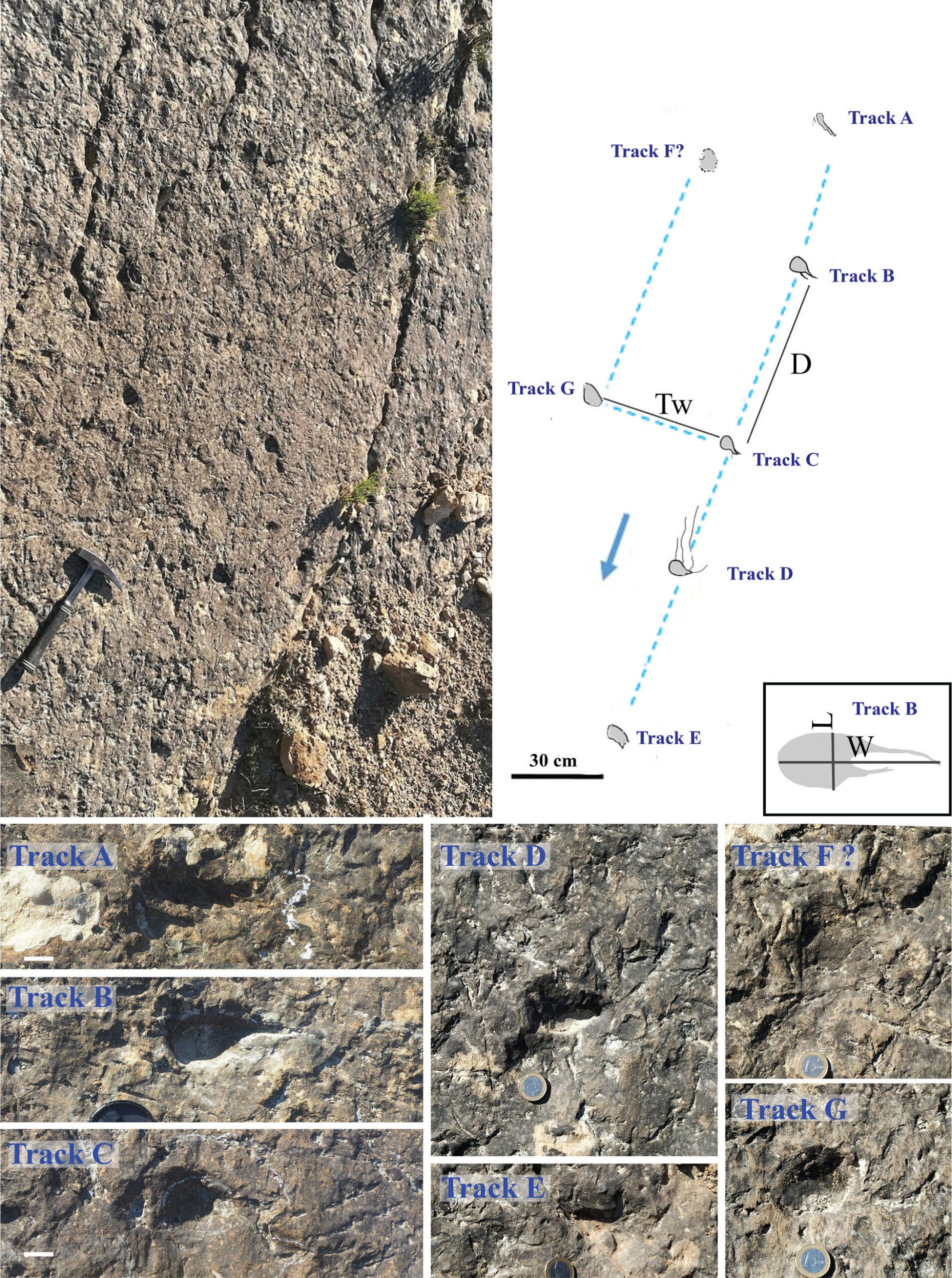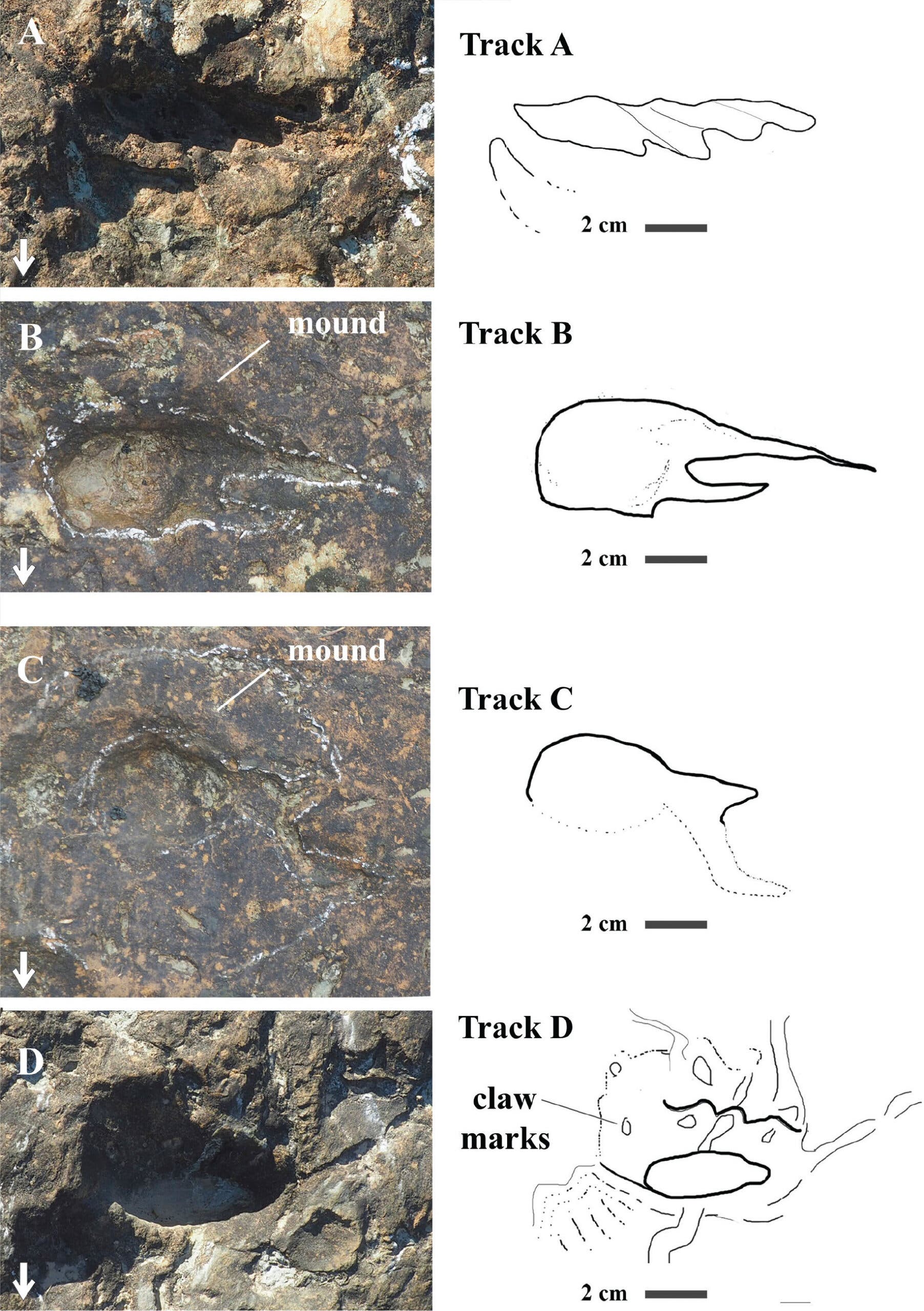 El conjunto de huellas, clasificadas como aff. Dikoposichnus, corresponden al rastro subacuático de uno de estos tetrápodos nadadores, que tenían cierta flotabilidad en el agua y usaban sólo sus patas delanteras a modo de remos para impulsarse sobre el fondo marino y desplazarse hacia adelante. «Las huellas encontradas en la provincia de Guadalajara, a diferencia de las asiáticas, contienen marcas de natación, con impresiones de uñas asociadas», explica Mélani.