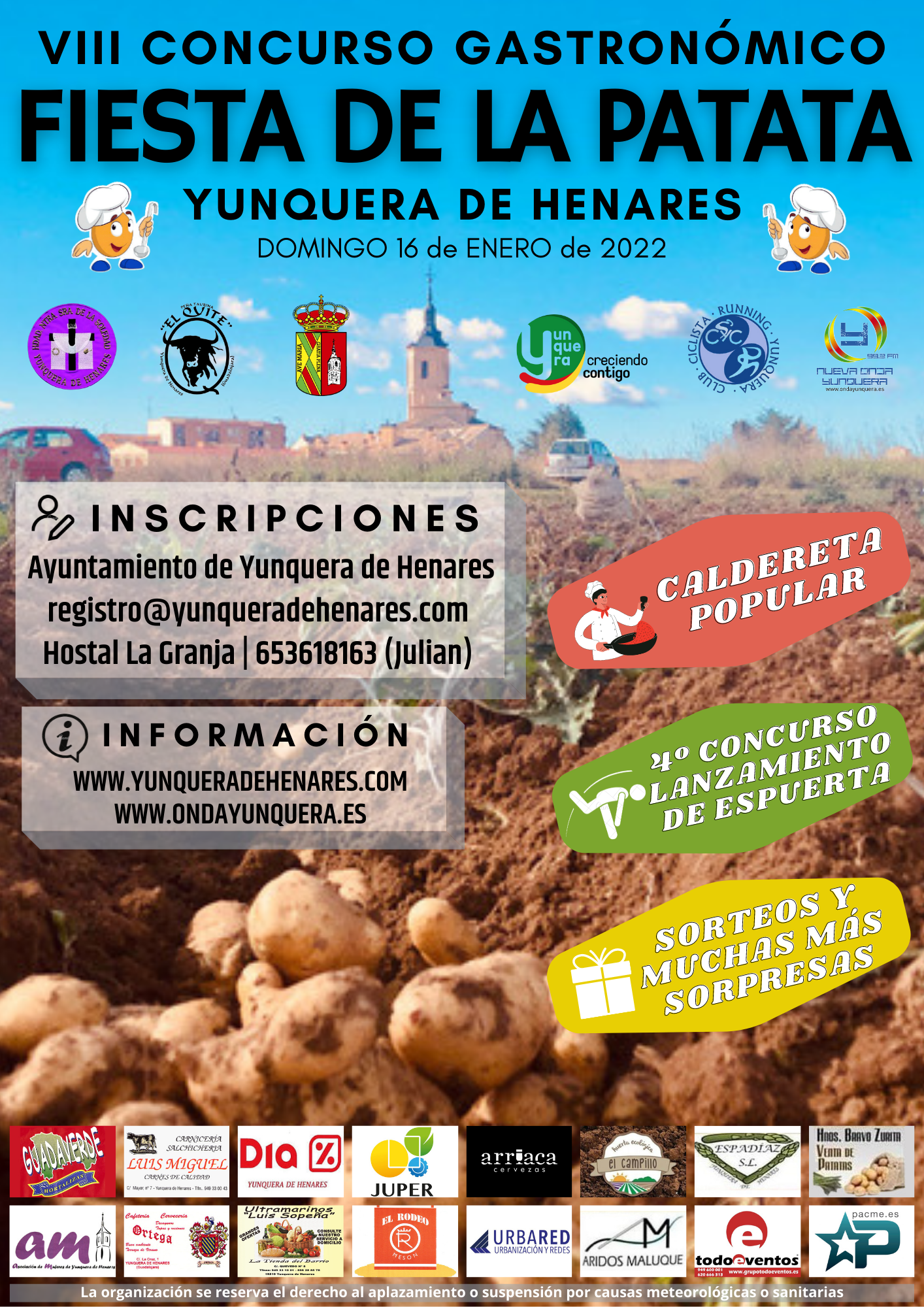 Yunquera de Henares rendirá un año más su particular homenaje a la patata con la organización del VIII Concurso Gastronómico en el que el ingrediente principal será la tan apreciada hortaliza. Este tendrá lugar el domingo, 16 de enero, a partir de las 09.00 horas en los terrenos situados detrás del Palacio de los Mendoza estando la inscripción abierta a la participación individual, por grupos y peñas.