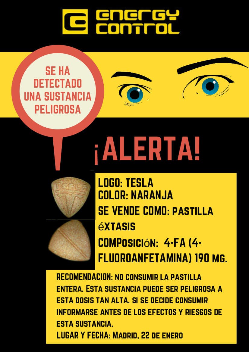 El programa de prevención de drogas Energy Control, de la Asociación Bienestar y Desarrollo, ha alertado en su página web de que ha sido detectado un lote de pastillas en Madrid, vendidas como éxtasis, que en su composición presenta el compuesto 4-FA (4-fluoroanfetamina) en una concentración muy alta (190 mg), lo que la convierte en una sustancia peligrosa.