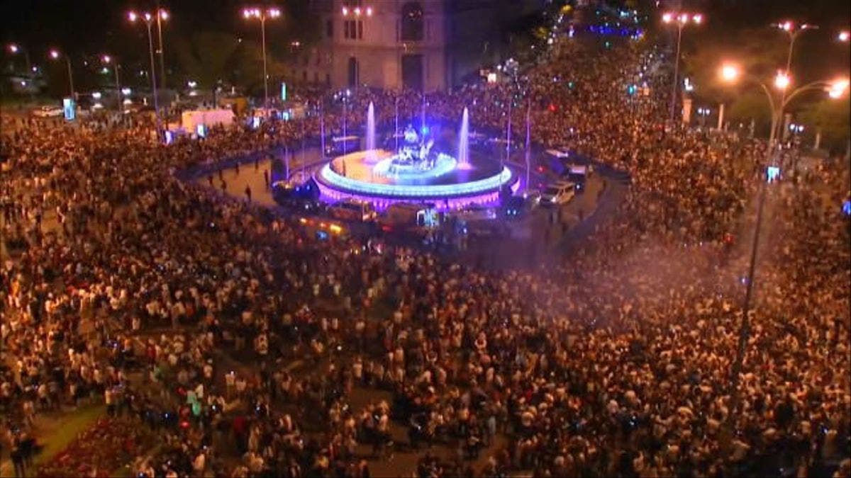 Alrededor de 400.000 personas, según la Delegación del Gobierno en Madrid, han celebrado en la madrugada de este domingo en la Plaza de Cibeles la victoria del Real Madrid en la Champions.