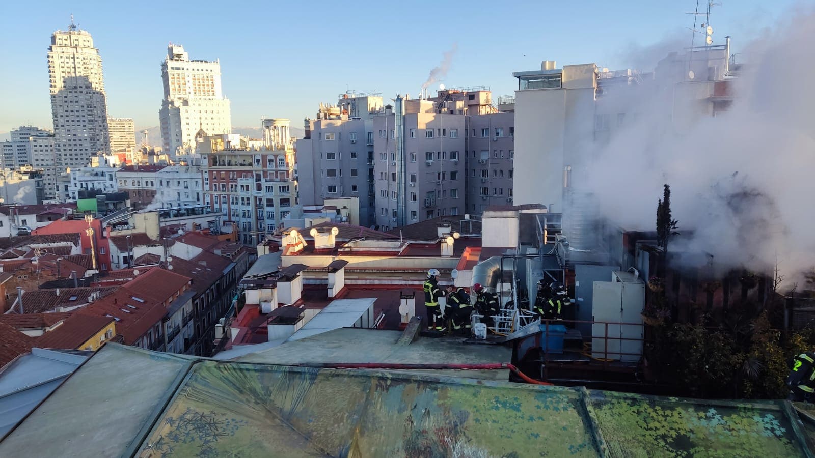 Aparatoso incendio en la azotea de un hotel del centro de Madrid