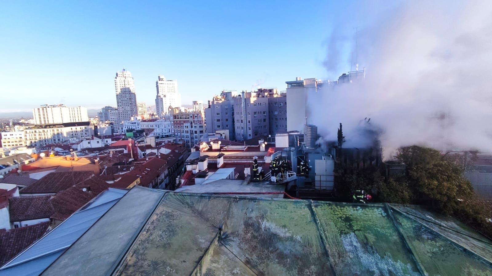 Aparatoso incendio en la azotea de un hotel del centro de Madrid
