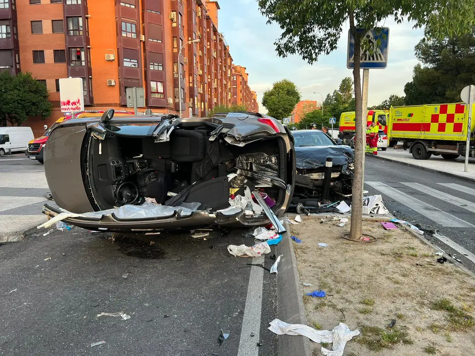 Aparatoso vuelco de un coche en plena calle en Madrid