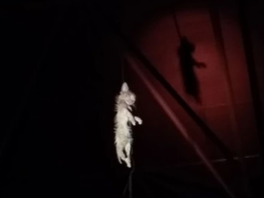 Una vez llegaron los servicios de emergencias encontraron al gato colgando de un techado y tuvieron que intervenir los Bomberos para retirar el cadáver.