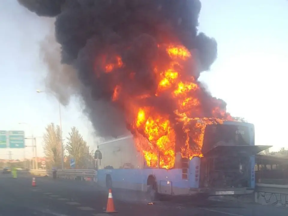 Un autobús de la Empresa Municipal de Transportes (EMT) fuera de servicio ha ardido este pasado lunes por la tarde en el anillo exterior de la M-40, a la altura del kilómetro 15, en el distrito de Vicálvaro, según ha informado Emergencias Madrid