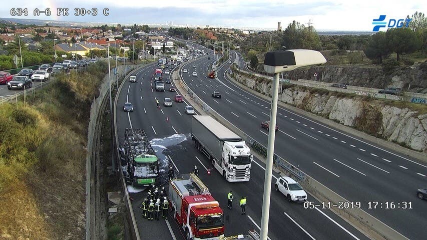 Arde un autobús interurbano en la A-6 provocando un gran atasco
