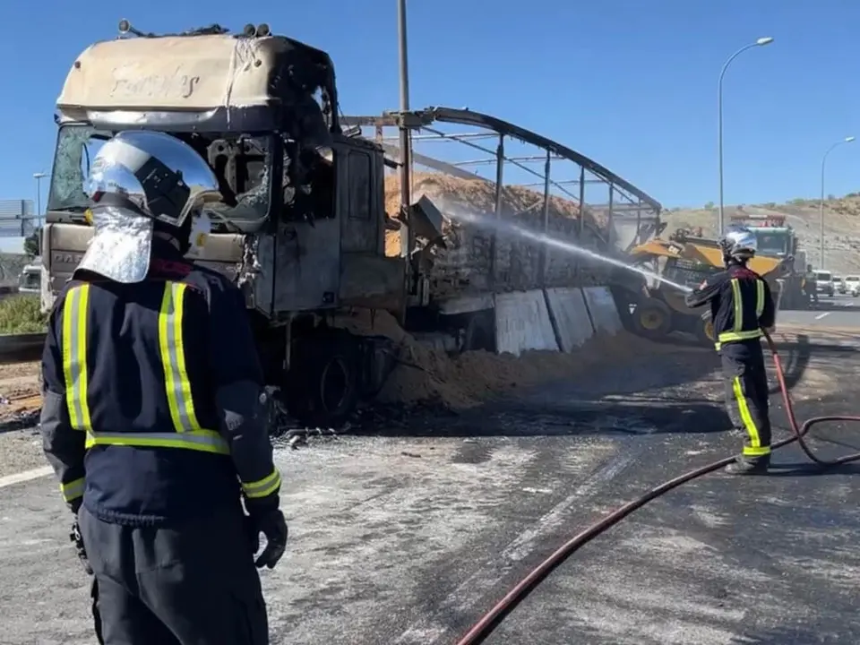 Un camión que transportaba unas 25 toneladas de pélets ha ardido por completo este jueves por la tarde en el kilómetro 35 de la carretera M-45, a la altura de San Fernando de Henares, donde ha tenido que ser cortado el tráfico.