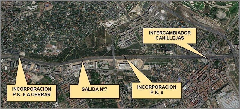 Durante esta última fase, los días laborables se cerrará al tráfico en horario nocturno el tronco de la autovía A-2 entre los kilómetros 5 y 9, en sentido Zaragoza, disponiendo los usuarios de un itinerario alternativo por la salida número 5 a través de la calle Josefa Valcárcel hasta la Glorieta de Canillejas, desde la cual los vehículos podrán acceder de nuevo al tronco de la autovía.