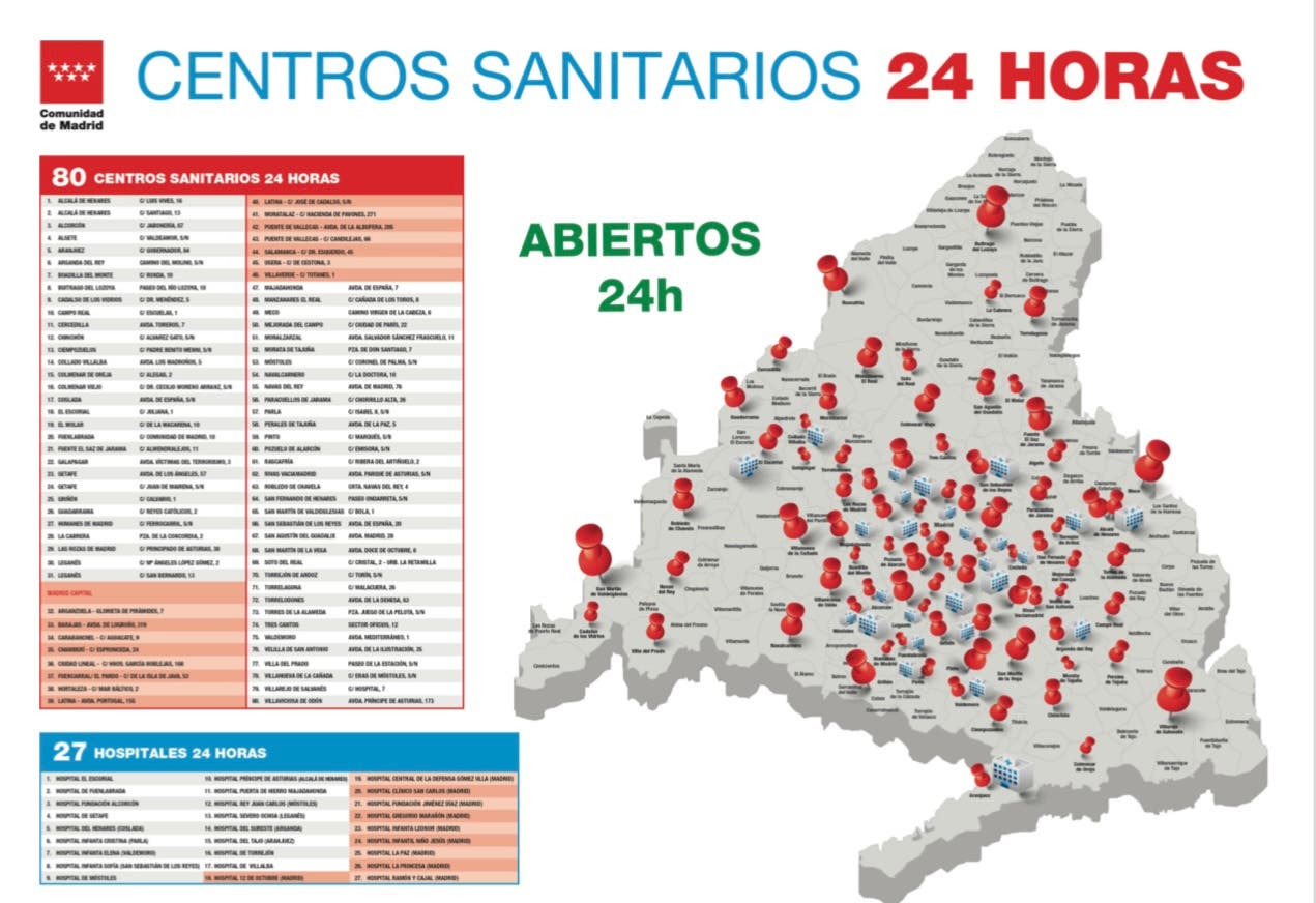 Del total de 80 Centros Sanitarios 24 horas, en Madrid capital abrirán 15 en los distritos de Carabanchel, Latina (2 puntos), Puente de Vallecas (2 puntos), Barajas, Fuencarral-El Pardo, Usera, Salamanca, Chamberí, Arganzuela, Moratalaz, Ciudad Lineal, Hortaleza y Villaverde.