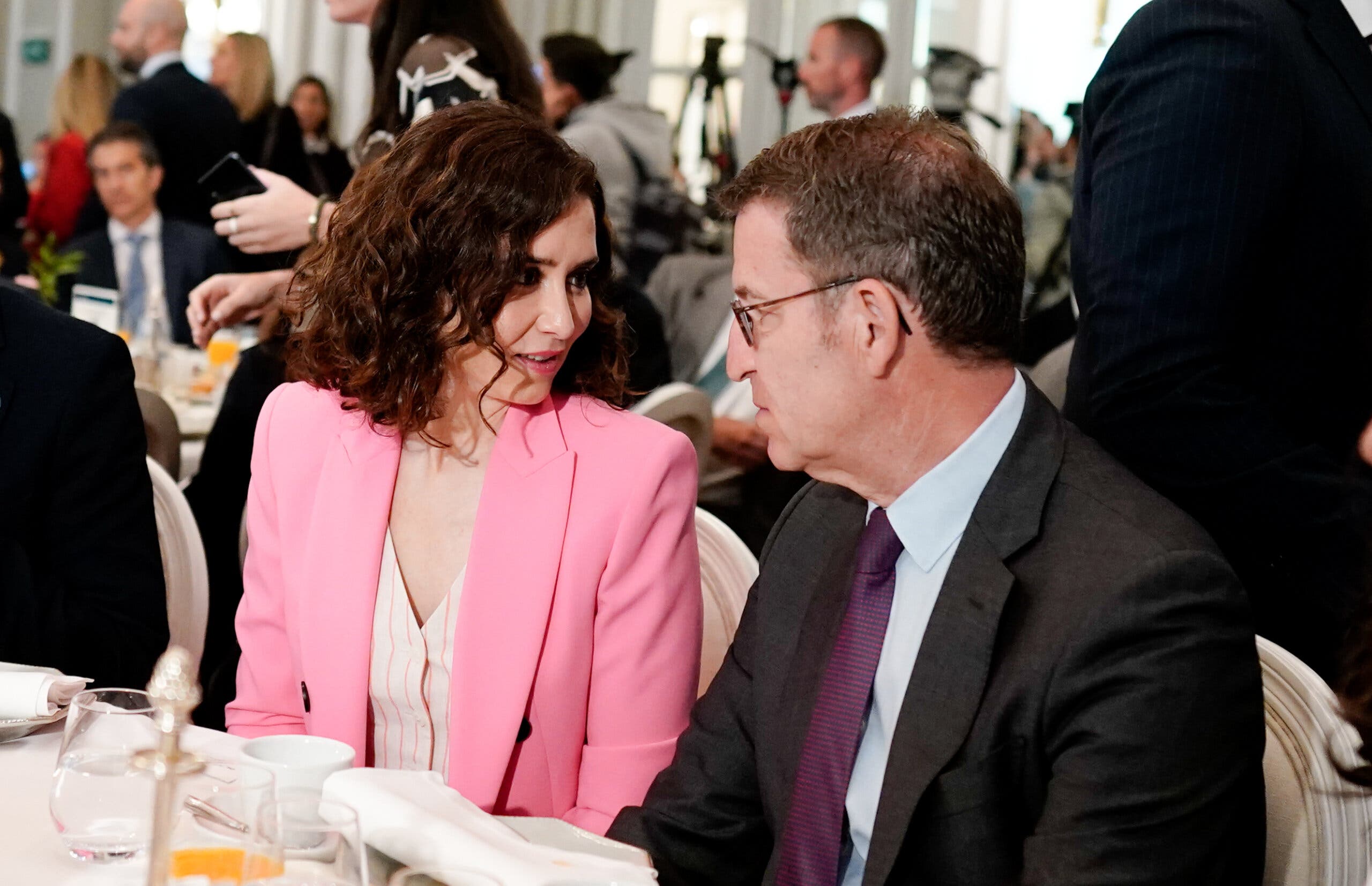 La presidenta madrileña ha defendido sus anteriores rebajas fiscales, en las que quiere «ir a más», ha dicho este lunes durante un desayuno informativo, al que también han acudido el líder nacional del PP, Alberto Núñez Feijóo; el alcalde de Madrid, José Luis Martínez Almeida, y otros dirigentes del partido.