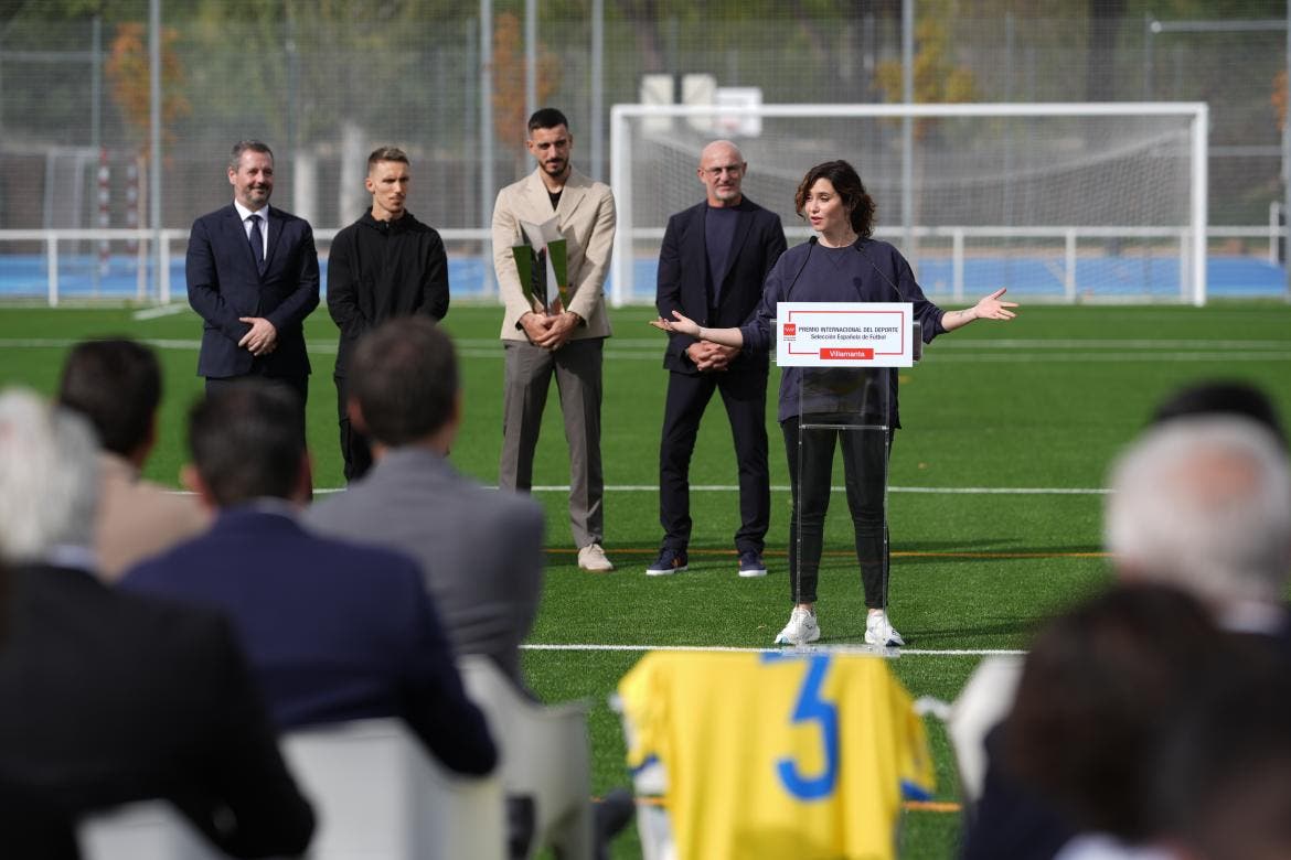 La presidenta de la Comunidad de Madrid, Isabel Díaz Ayuso, ha entregado hoy en el recién reconstruido campo de fútbol de Villamanta el Premio Internacional del Deporte de la Comunidad de Madrid a la Selección española masculina de fútbol, que ha recibido el seleccionador Luis de la Fuente. Díaz Ayuso ha subrayado que este galardón «celebra victorias, pero también el triunfo de valores como equipo, constancia, sacrificio, ambición y humildad».
