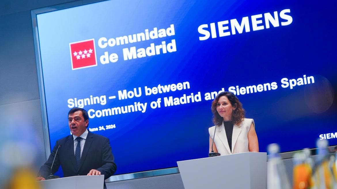 La presidenta de la Comunidad de Madrid, Isabel Díaz Ayuso, ha firmado hoy en Múnich (Alemania) un acuerdo para «multiplicar todo el potencial y el talento industrial y tecnológico» de la multinacional alemana en la región. La jefa del Ejecutivo autonómico ha suscrito este convenio de colaboración con el presidente y CEO de Siemens España y Siemens Mobility SouthWest Europe, Agustín Escobar, gracias al  que expertos de la compañía impartirán formación a profesionales en centros adscritos a la Administración regional vinculada a nuevas tecnologías como Inteligencia Artificial, Ciberseguridad o Conectividad.