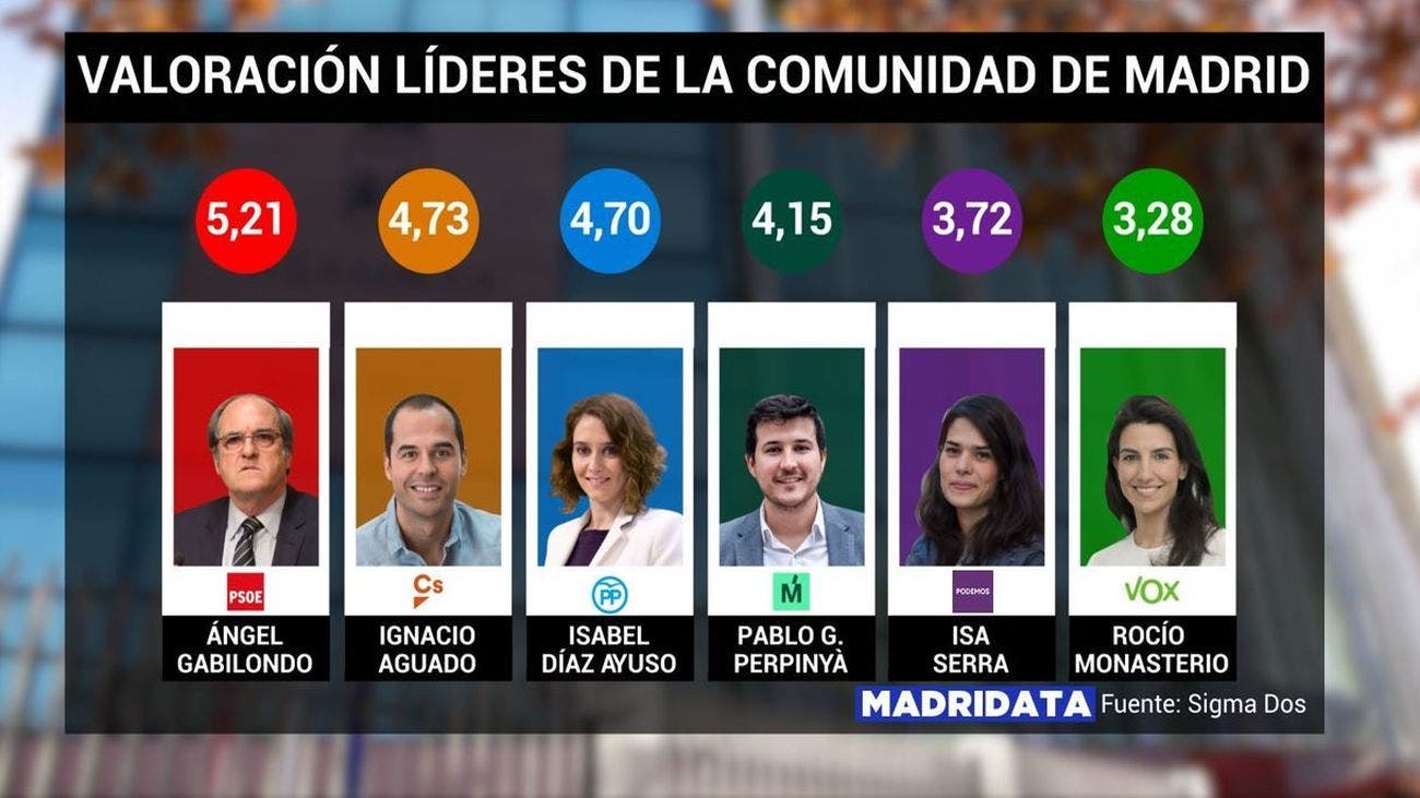 Isabel Díaz Ayuso, suspende en valoración para los madrileños, con una nota de 4,70, por debajo ligeramente de su socio de Gobierno, Ignacio Aguado (Ciudadanos), que obtiene un 4,73. Por debajo en calificación se encuentran Pablo Gómez Penrpinyá (Más Madrid), con un 4,15; Isa Serra (Unidas Podemos), con un 3,72; y Rocío Monasterio (Vox), con una calificación de 3,28.