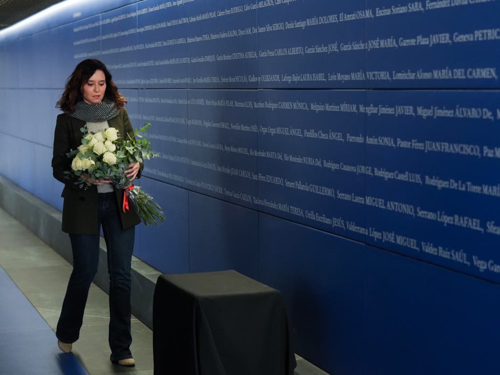La jefa del Ejecutivo madrileño ha depositado un ramo de rosas blancas en el memorial ubicado justo debajo de la zona que ocupaba el cilindro conmemorativo que se encontraba en el exterior, un sitio de recogimiento para honrar a los fallecidos que ahora se ha ampliado con la incorporación de La Sombra del Monumento a las Víctimas del 11M, un símbolo circular que representa al antiguo monolito.