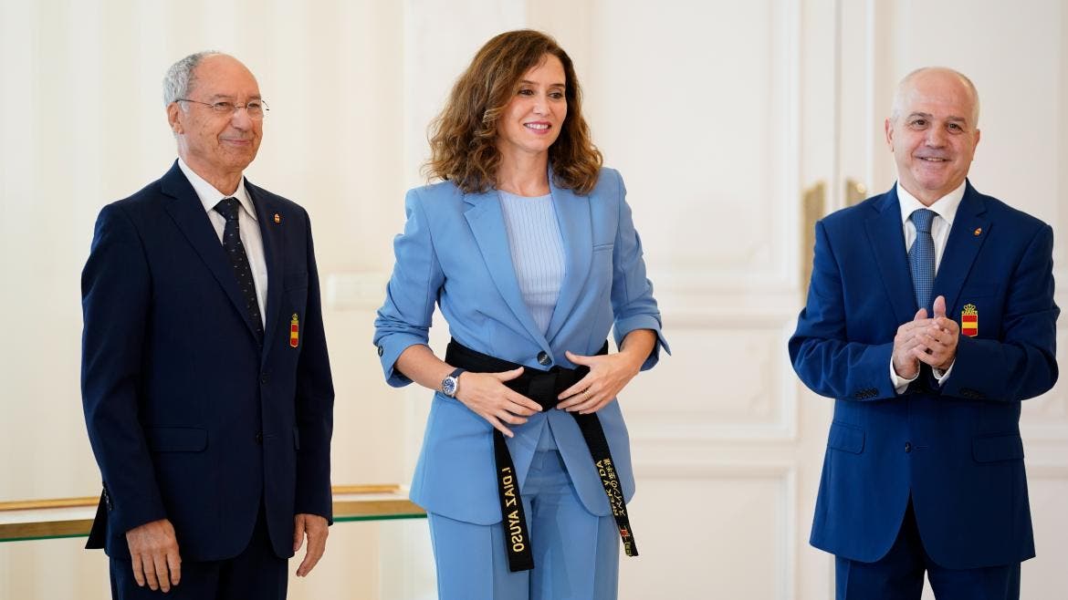 La presidenta de la Comunidad de Madrid, Isabel Díaz Ayuso, ha recibido hoy, en la Real Casa de Correos, la Insignia de Oro de la Real Federación Española de Kárate y Disciplinas Asociadas que le han entregado su presidente, Antonio Moreno, y el presidente de la Federación Madrileña, Antonio Torres.