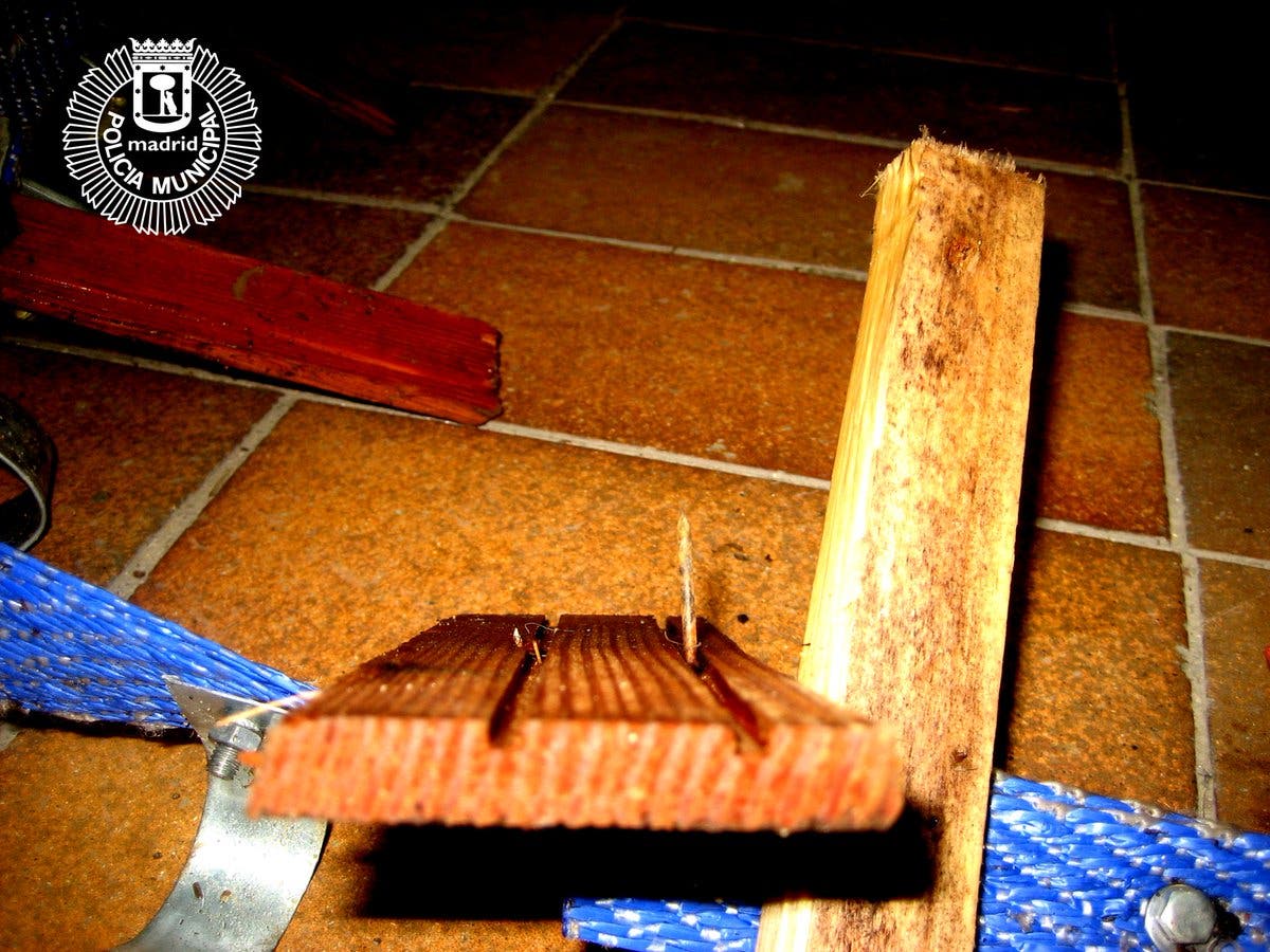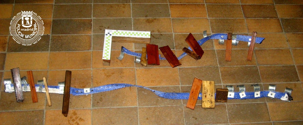 Esta misma semana, un vecino que estaba paseando por la Casa de Campo ha encontrado una trampa punzante para ciclistas formada por trozos de madera y clavos.