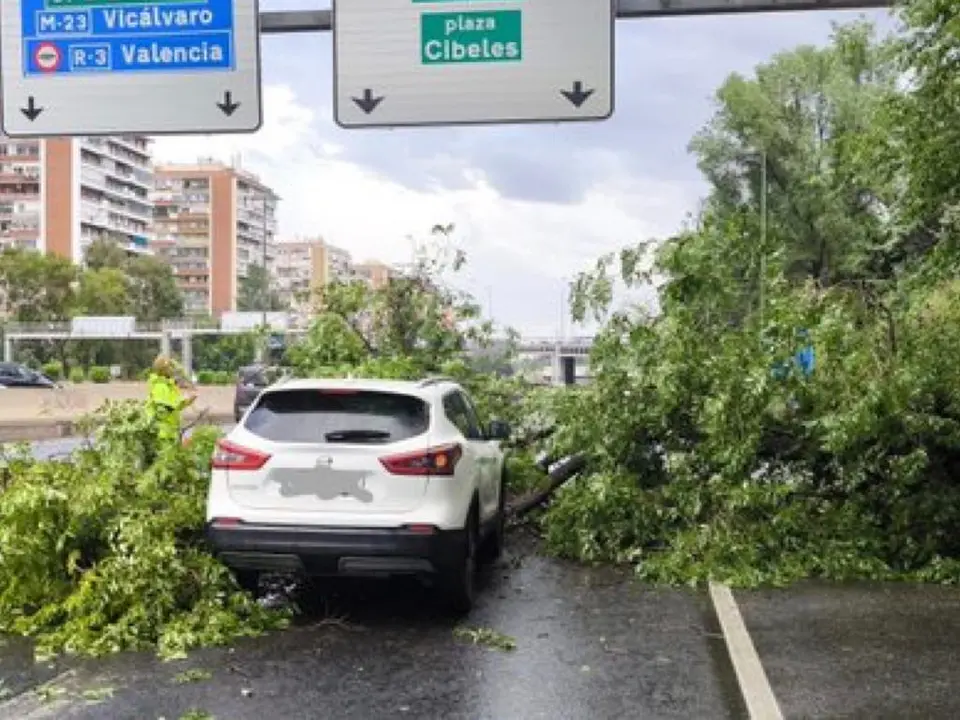 Un árbol ha caído este miércoles por la tarde sobre un coche que circulaba por la M-30, a la altura del distrito madrileño de Salamanca, a consecuencia de la tormenta que ha tenido en aviso naranja a la capital.