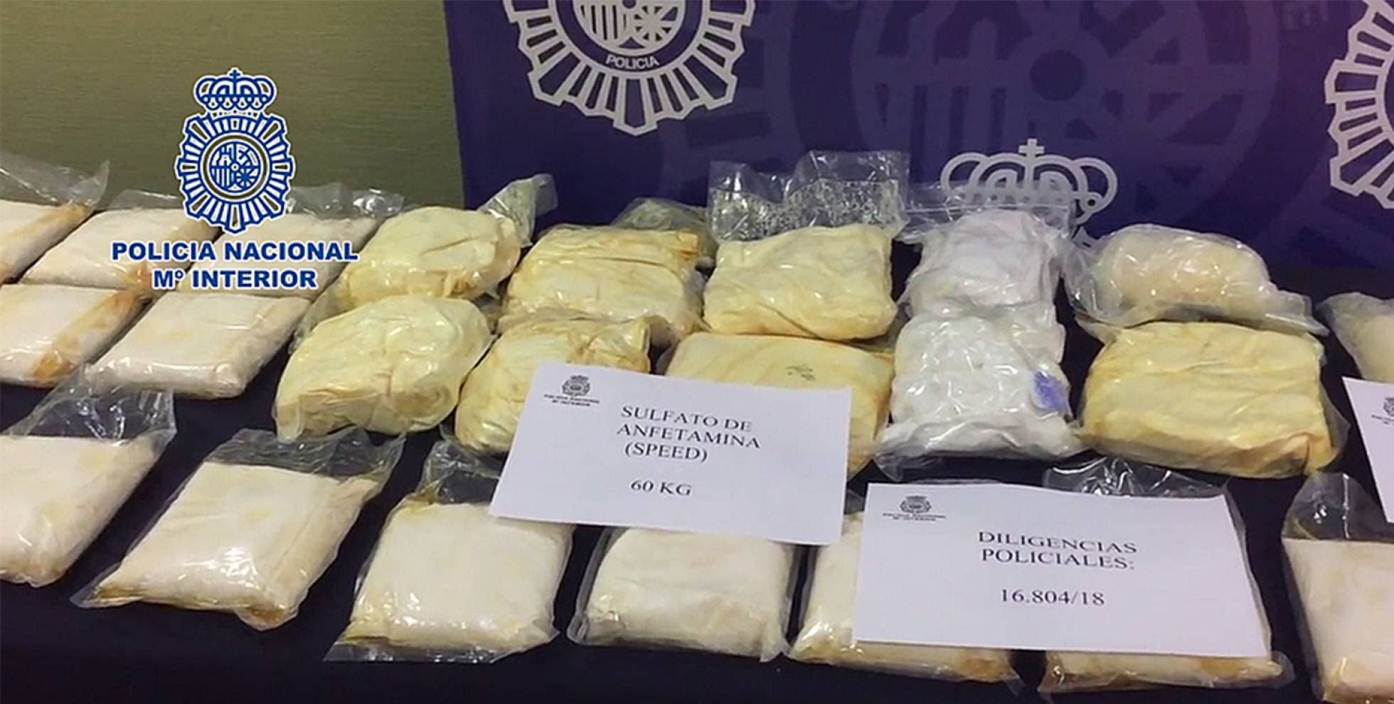 Los agentes han incautado 66 kilogramos de speed (sulfato de anfetamina), más de 7 kilos de heroína, 134 bellotas de hachís, 250 gramos de pastillas de hachís, 30 gramos de cocaína en roca, dos revólveres, una pistola detonadora, una escopeta de cañones superpuestos y 130.000 euros en efectivo.