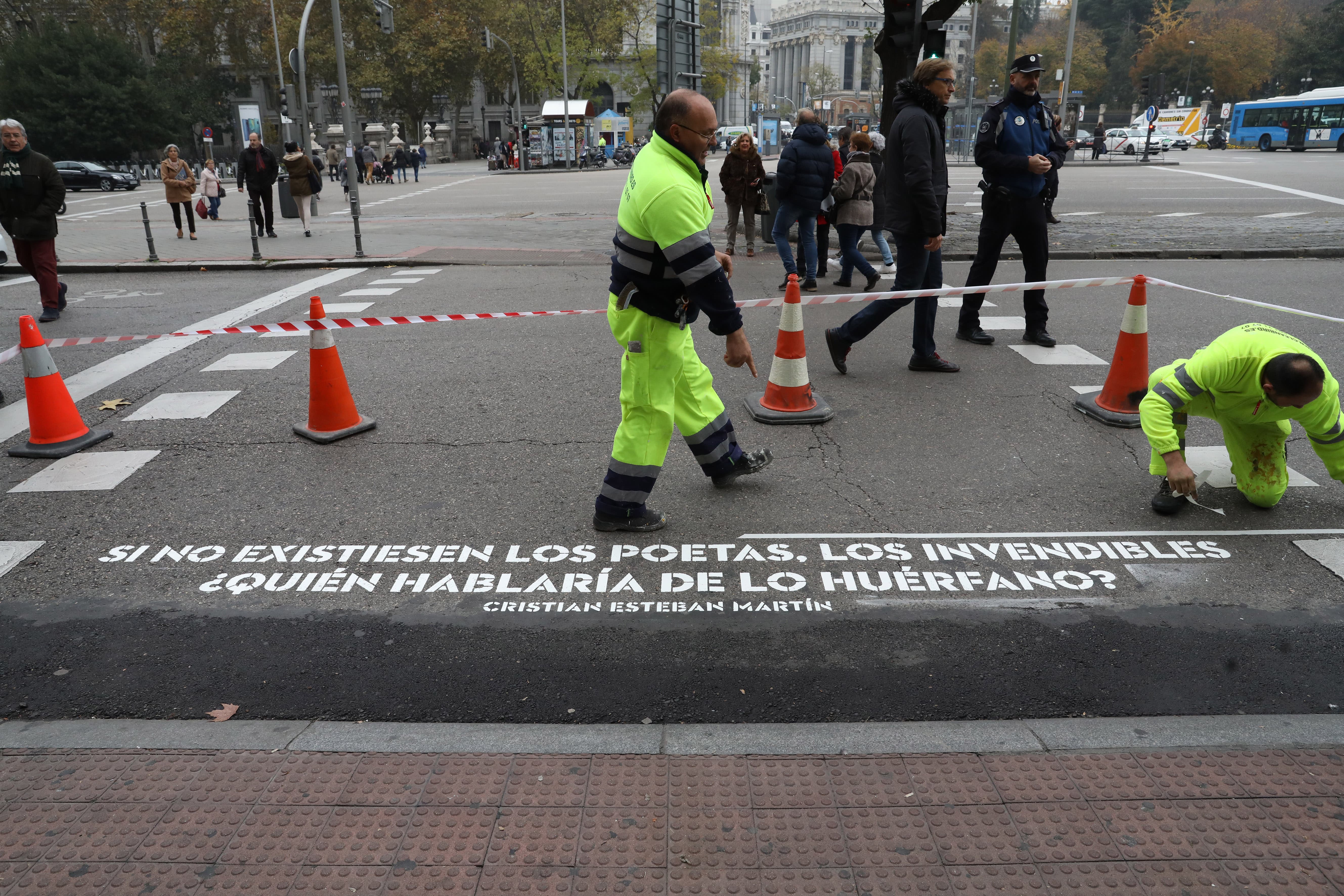 El verso pintado en el cruce de Paseo del Prado con la Plaza de Cibeles cierra la fase de creación de Versos al paso, la iniciativa del Ayuntamiento de Madrid y el colectivo Boa Mistura que ha plasmado 1.100 versos en otros tantos pasos de cebra de toda la ciudad.