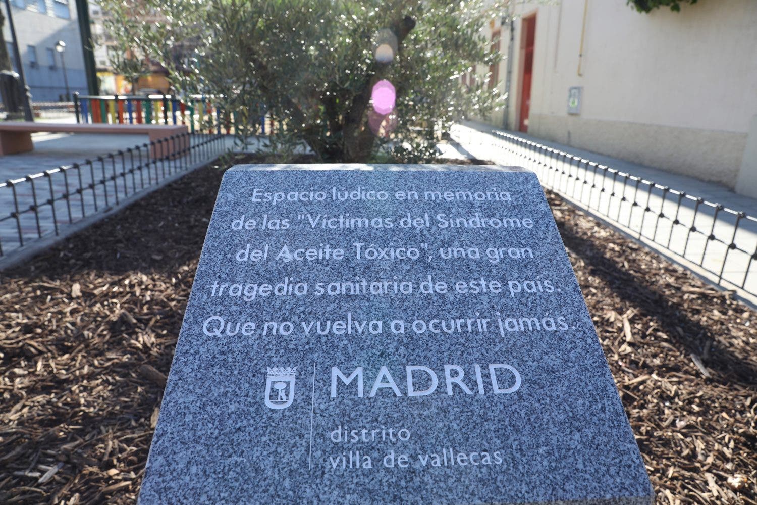 El acto ha tenido lugar en el Paseo de Federico García Lorca, en el distrito de Villa de Vallecas, donde el Ayuntamiento recientemente ha creado un espacio lúdico para recordar a las víctimas y ha instalado un monolito con la siguiente inscripción: Espacio lúdico en memoria de las víctimas del síndrome del aceite tóxico. Una gran tragedia sanitaria de este país. Que no vuelva a ocurrir jamás. Distrito Villa de Vallecas.
